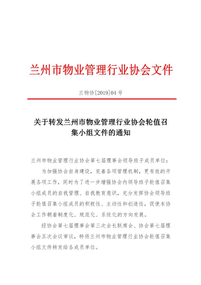 关于转发兰州市物业管理行业协会轮值召集小组文件的通知